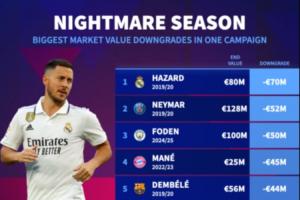 单赛季身价最大下跌榜:阿扎尔领跑&两上榜,19/20赛季梅西入列